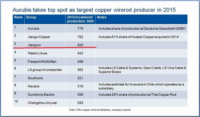 日前,英國商品研究所(簡稱:CRU)發(fā)布了全球銅桿生產(chǎn)商排名,江潤銅業(yè)位列第三。 英國商品研究所是礦產(chǎn)、金屬、電線電纜等行業(yè)內(nèi)世界領(lǐng)先的權(quán)威分析機(jī)構(gòu),總部位于倫敦,全球擁有各國專家超過250人,包括經(jīng)濟(jì)學(xué)家、管理顧問、工程師、冶金學(xué)家、地質(zhì)學(xué)家、化學(xué)家及媒體從業(yè)人員。多年來,英國商品研究所作為世界知名的金屬市場(chǎng)分析及咨詢公司,以其獨(dú)立性和權(quán)威性得到行業(yè)內(nèi)的廣泛認(rèn)可,其分析報(bào)告和數(shù)據(jù)統(tǒng)計(jì)被行業(yè)內(nèi)普遍采用和參考。公司擁有兩條年產(chǎn)35萬噸SCR-7000銅連鑄連軋生產(chǎn)線,2015年生產(chǎn)銅桿62萬噸;深加工裸銅線25萬噸、鍍錫銅線2萬噸、束絞銅線6萬噸。江潤銅業(yè)專心、專業(yè)、專注于銅導(dǎo)體研發(fā)制造領(lǐng)域近四十年,未來將繼續(xù)秉承“一流裝備技術(shù)、一流產(chǎn)品服務(wù)、一流客戶市場(chǎng)”的經(jīng)營理念,以信致遠(yuǎn)、以精至臻,穩(wěn)健、進(jìn)取的核心價(jià)值觀,踐行工業(yè)理想,肩負(fù)歷史使命和社會(huì)責(zé)任,引領(lǐng)行業(yè)發(fā)展,創(chuàng)建具備國際競(jìng)爭(zhēng)力的一流銅加工企業(yè)。